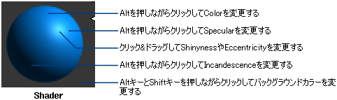 キー(Mac)を押しながらクリックすると、Color Editor が開き、シェーダ アイコンの背景カラーを編集することができます)。球体のハイライトをクリック&ドラッグすれば、シェーダの Shinyness や Eccentricity の値をインタラクティブに変更できます。