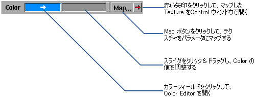 アクティブな Environment、シェーダ、ライトの Color パラメータの Color Editor、またはアクティブな Texture の Rgbmult パラメータのカラー エディタが開きます。Control ウィンドウのパラメータのカラー フィールドをクリックしても、Color Editor を開くことができます。