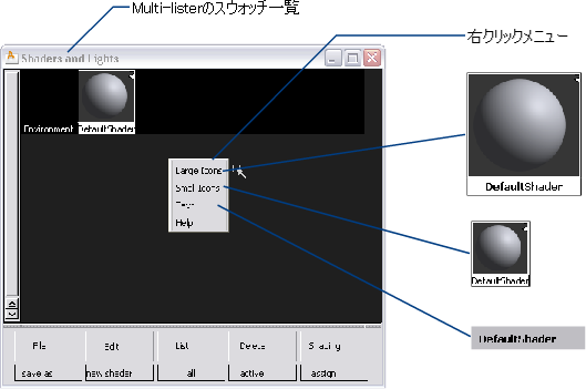 を使用します。後のすべてのセッションでの Default Shader を変更するには、DefaultShader という名前を使用してシェーダ フォルダにシェーダを保存します。Multi-lister の DefaultShader を変更しても保存しなければ、変更内容はそのセッション中のみ適用されます。