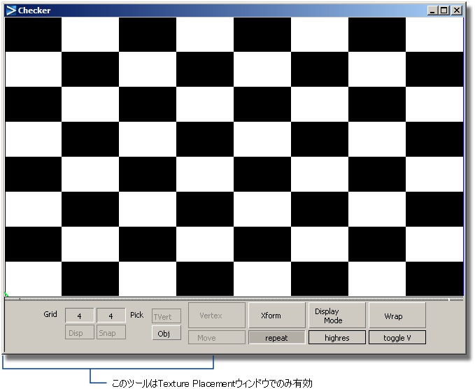 Pick ボタンである Obj(オブジェクト)と TVert(テクスチャの頂点)を使用すれば、ジオメトリや頂点をモデリング ウィンドウで選択したり、Texture Placement ウィンドウにロードすることができます。モデリング ウィンドウ内でのジオメトリや頂点の選択は、Pick > Point Types > CV