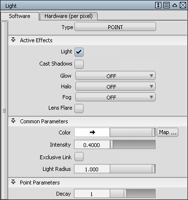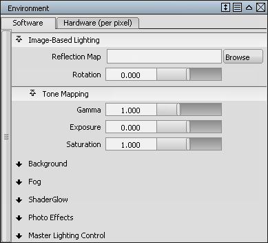 アクティブな Environment、シェーダ、テクスチャ、ライトの Control ウィンドウが開きます。Control ウィンドウは、Multi-lister 内のEnvironment スウォッチ、Shader スウォッチ、Texture スウォッチ、Light スウォッチをダブルクリックして開くこともできます。