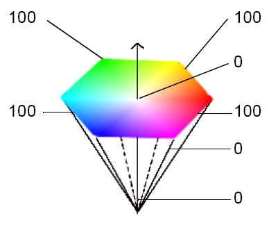 明度はカラーの明暗を区別します。黒の明度は0であり、白の明度は1です(彩度は0です)。2 つの六角錐の一番下のポイントは明度0 です。明度は 2 つの六角錐の軸に沿って高くなり、一番上のポイントでは 1 になります。