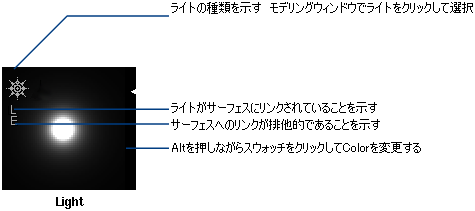 ライト スウォッチの左上コーナーには、ライトの種類を示すシンボルが表示されます。ライトに Force コンポーネントがあれば、ライト スウォッチに Force の種類を示すシンボルが表示されます。ライトがサーフェスにリンクされていれば、ライト スウォッチには L の文字が表示されます。また、サーフェスへのリンクが排他的であれば、ライト スウォッチには E の文字も表示されます。