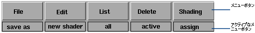 Multi-lister のメニューには、Environment、シェーダ、テクスチャ、ライトの作成、編集、管理、表示を行うツールが含まれています。メニューを表示するには、Multi-Lister ウィンドウの下部にあるメニュー ボタンをクリックした状態のままにします。各ボタンの下に、既定のアクティブメニュー項目が以下のように表示されます。