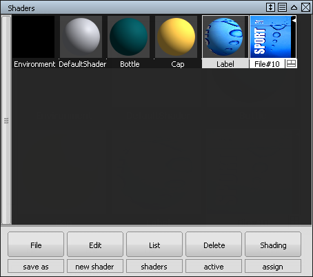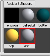 ラベルのグラフィックがシェーダにどのように適用されているか確認するには、Render > Multi-lister > Shaders を選択します。 Multi-listerはシェーダを使って作業するときにVisualize Panelの代わりとなるものです(これは次のセクションでライトの操作をするときに使用します)。