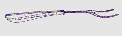バーベキューフォークは、シェイプを作業場で作成する場合と同じ方法でモデリングされます。フォークの先を1枚の鋼板と考えて、長さに沿ってゆるやかなカーブが作成されています。先のシェイプは後で切断されます。ハンドルは 2 つの大きなモノレイル サーフェスから作成され、交差、トリミング、およびフィレット処理が実行されます。