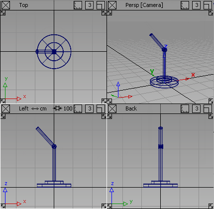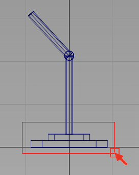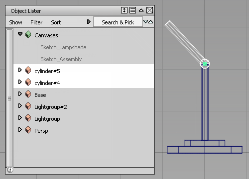 ここでは、グループ化によってモデルを組織化します。1 つのグループはスタンドの基部に、もう 1 つのグループは傾斜したアームと蝶番にします。Object Lister を使用してグループの名前付けと管理を行います。Object Listerは、シーンのオブジェクトの概略ビューです。これはデザインのコンポーネント管理に便利です。