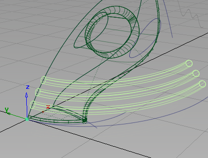 3 つの押し出されたチューブのシェイプから溝のサーフェスを作成します。チューブのプロファイルは円形であり、メインの胴体の全体シェイプに従ってパスが続きます。魅力的な交差ラインを作成するには、溝が外側の端でフェード アウトするように、パス カーブを胴体のシェイプから引き離していきます。