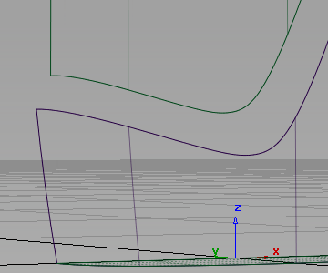 Birail サーフェスが滑らかでピンと張った状態になるように、CV が 3 つだけのカーブを使用してブレンドの特徴を定義します。2 つの CV はラベル サーフェスに対する接線連続性をコントロールし、3 つ目の CV は胴体サーフェスに対する位置連続性をコントロールします。