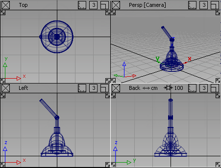 次に、スタンドのかさを作成します。2 つの半球体からスタンドのかさの主要なシェイプを作成します。まず大きな半球体を作成し、その上に小さな半球体を作成します。次に、円柱を追加して、かさをアームに結合します。