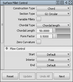Surface Fillet ツールは、各種モードで使用することができます。デフォルト モードは、胴体のフィレットで使用しましたが、円形フィレットを作成するためのものです。円形フィレット モードはフィレット サーフェスの長さに沿った一定半径のサーフェスを作成します。
