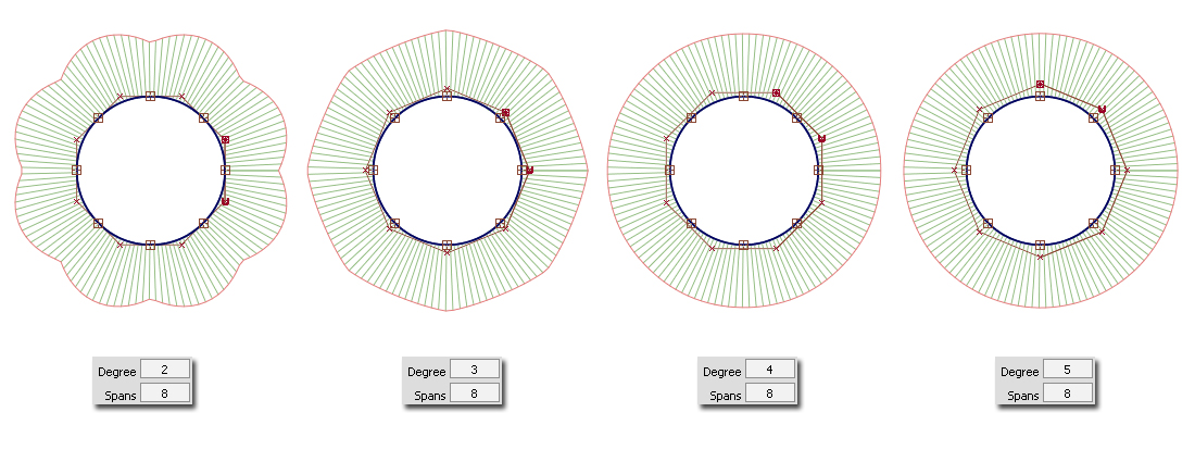 The internal continuity between spans is directly related to the Degree (shown below). So if you need to use multi-span curves or surfaces, choosing higher Degrees will make the result more smooth.