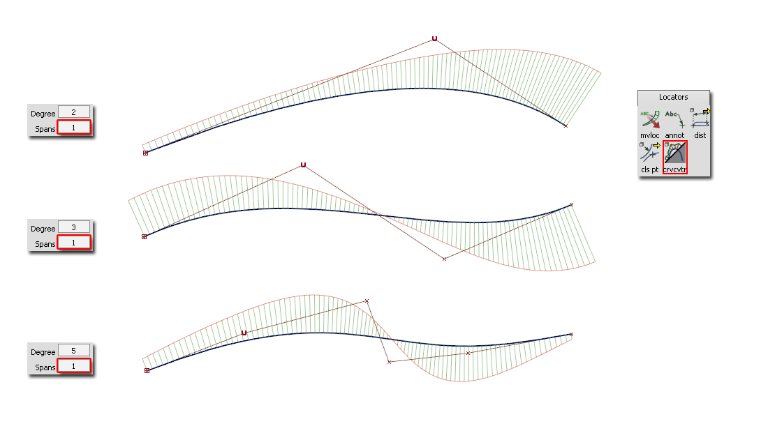 Continuity breaks can occur between spans, but the effect is reduced with higher Degree. The following examples are all 3-Span curves, but with different Degree: