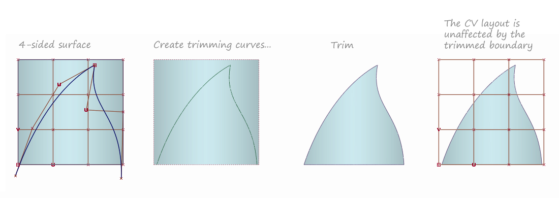 NURBS surfaces are inherently four-sided, they have four distinct boundaries. Sometimes a design requires a surface patch with 3, 5, 6, 7 etc. boundaries, or a hole in a surface.