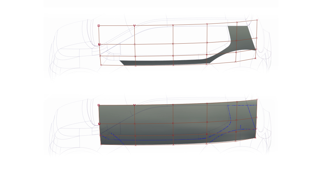 Try to keep the number of n-sided patches to a minimum, by trying to find 4-sided patches wherever possible. Here are examples where n-sided surfaces were needed for the car model: