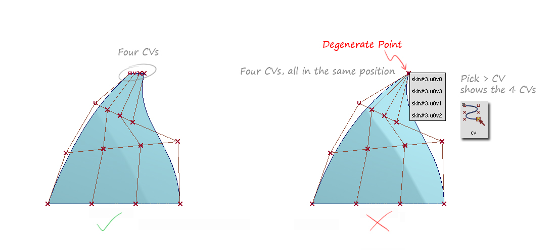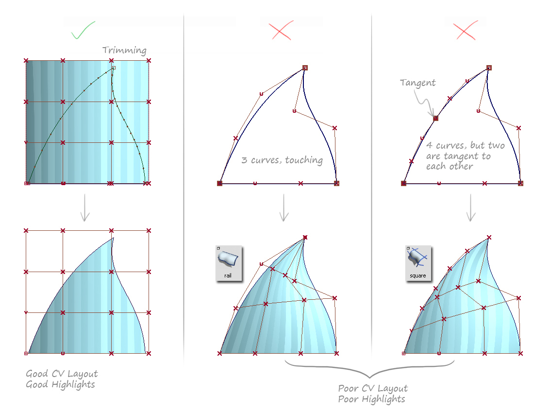 The methods shown above create a 'degenerate point', where a whole row of CVs are collapsed onto a single position. This creates very bad highlights and can cause many problems downstream, such as Rounds and Fillets failing, and so is to be avoided at all times.