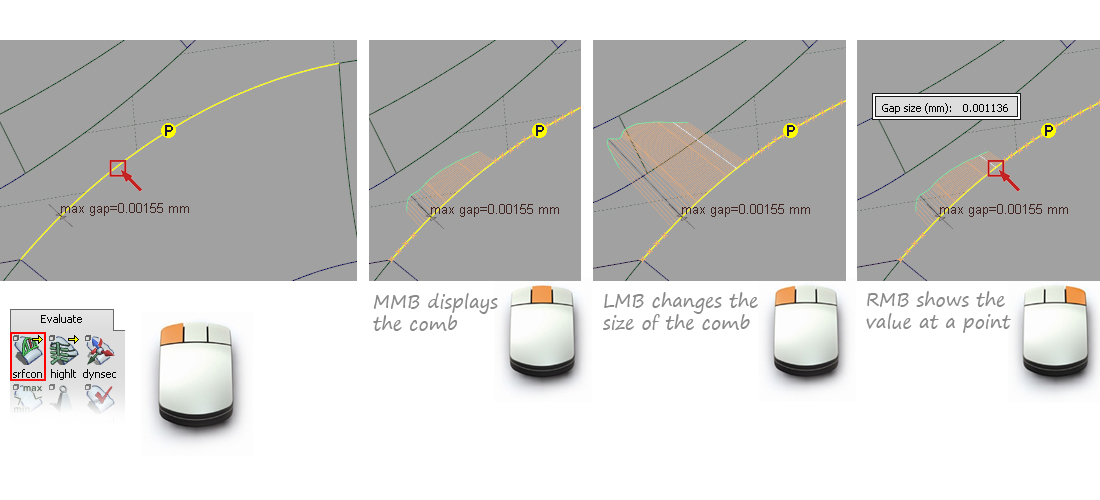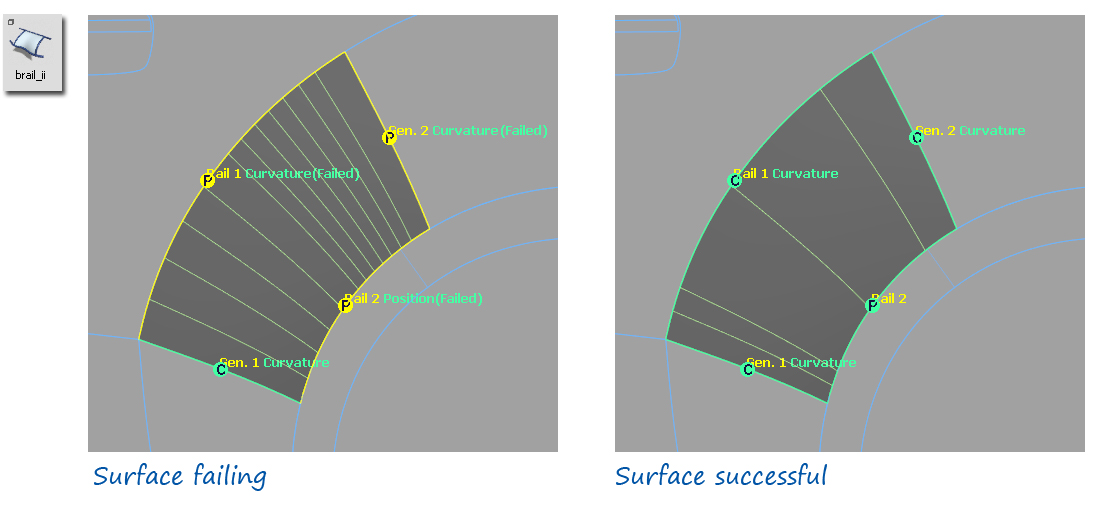 The letters P, T, C – Position (G0), Tangent (G1,) Curvature (G2) – are displayed to show which level of continuity has passed or failed.