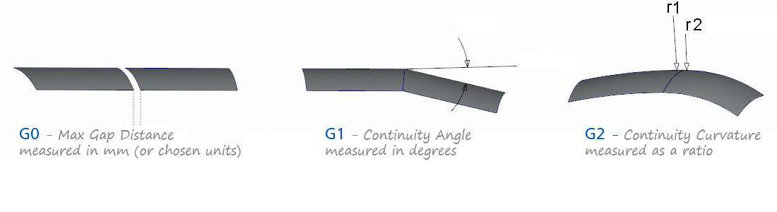 The G0, G1 and G2 measurements are made where two surface patches meet:
