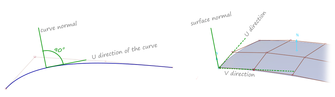 The 'Normal' direction is at 90 degrees the curve or surface direction, and it is always linked to the U and V parameter directions: