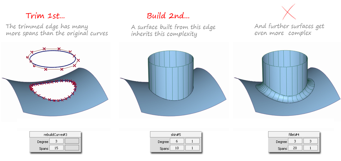 This is because trimmed edges will typically have more CVs than 'natural' surface edges, so avoid building surfaces from them where possible: