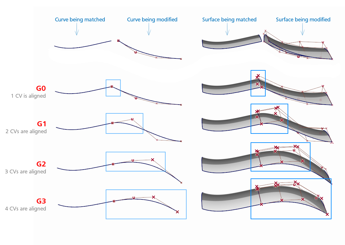 Continuity is achieved by controlling the CVs at the edge of the aligned curve or surface. A higher continuity level requires more CVs to be aligned.