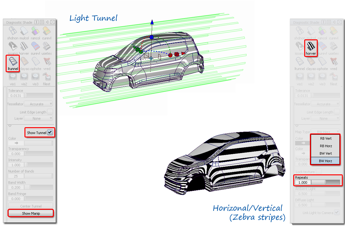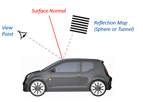 The first method is to display evaluation 'stripes' (or 'reflection lines'), and there are a number of tools for this in Diagnostic Shade. They are often thought of in the same way, but there are important differences in the way the stripes are calculated: