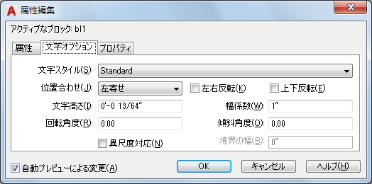 属性文字の文字スタイルを指定します。この文字スタイルの既定値が、このダイアログ ボックスに表示されている文字プロパティに割り当てられます。