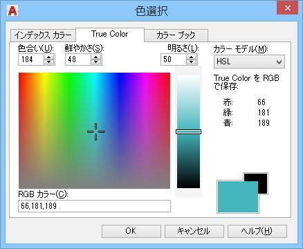 RGB カラー モデルを使用して、色を選択します。[True Color]タブで使用できるオプションは、HSL と RGB のどちらのカラー モデルを指定するかによって異なります。