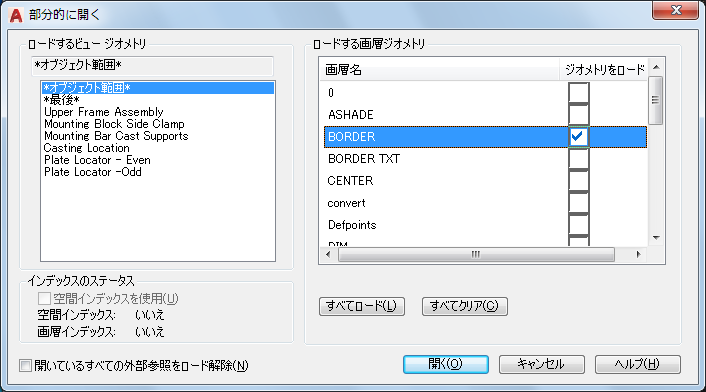 追加のジオメトリを指定して部分的に開いた図面にロードする場合に使用可能なビューと画層が表示されます。