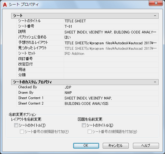 選択したシート固有の情報、たとえばシートのタイトル、シート番号、パブリッシュ処理に含めるかどうかなどが表示されます。カスタム プロパティがある場合には、これも表示されます。