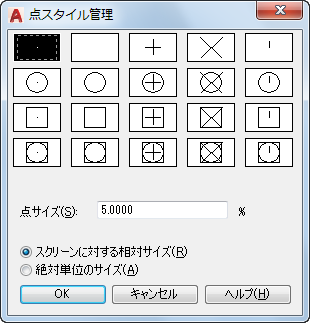 点の表示サイズをスクリーン サイズとの相対的な比率で設定します。ZOOM[ズーム]コマンドで拡大または縮小しても、表示される点の大きさは変わりません。