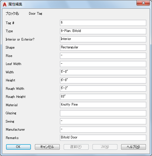 特定のブロックの名前が表示されます。このダイアログ ボックスには、ブロックに含まれている各属性の値が表示されます。
