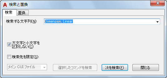 コマンドまたはコマンドのプロパティ(コマンドの名前、説明、マクロ)を検索、置換します。指定した文字列を検索するには、[検索]タブを使用します。指定した文字を検索および置換するには、[置換]タブを使用します。