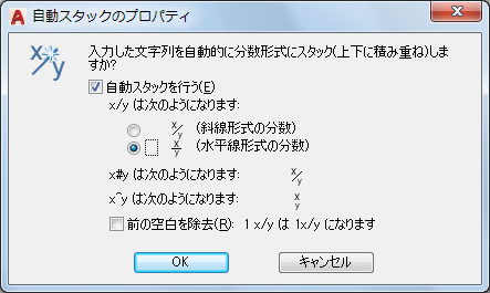 自動スタック機能がオンのとき、スラッシュ(/)を水平線分数に変換します。