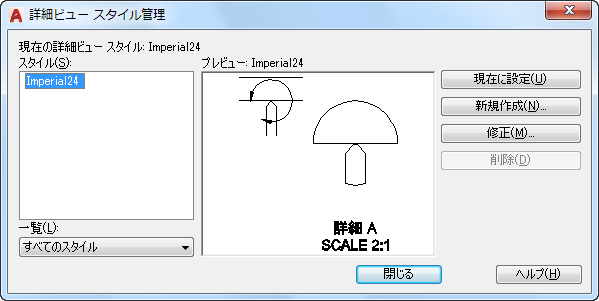 現在の図面ファイルで使用できる詳細ビュー スタイルの一覧を表示します。現在のスタイルはハイライト表示されます。