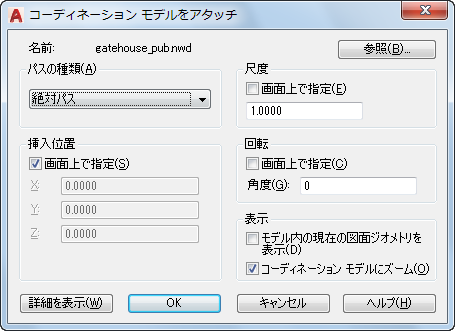 図面にアタッチされるコーディネーション モデルの挿入点を設定します。既定では、[画面上で指定]チェック ボックスがオンになっています。既定の挿入位置は、0,0,0 です。