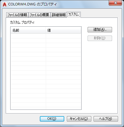 現在の図面のカスタム プロパティの名前と値がリストされます。