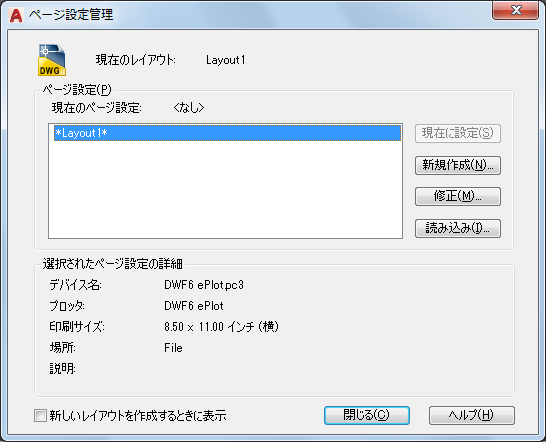現在のページ設定が表示されます。別のページ設定を現在のページ設定にしたり、新しいページ設定を作成したり、既存のページ設定を修正したり、他の図面からページ設定を読み込みます。