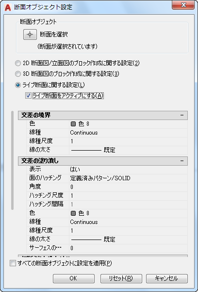 ライブ断面をオンにしたときの図面での断面オブジェクトの表示方法を決定します。