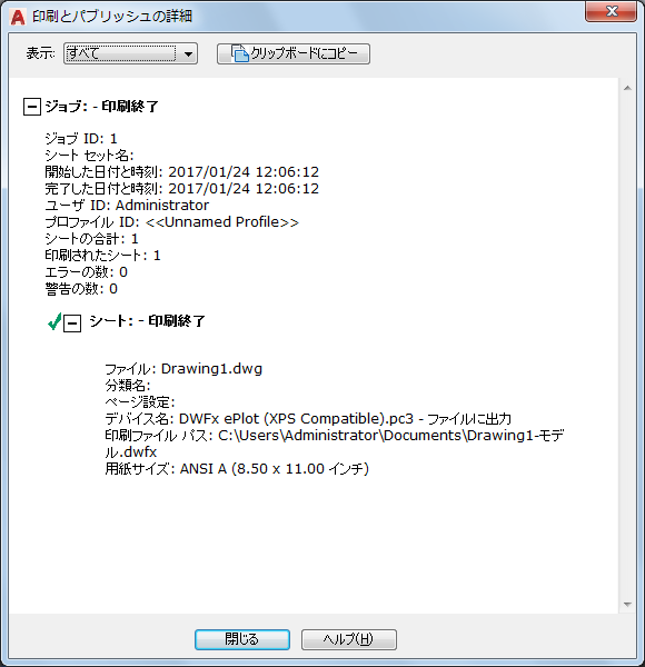 すべての完了した印刷とパブリッシュのジョブおよびこれらのジョブのシートに関する情報が表示されます。