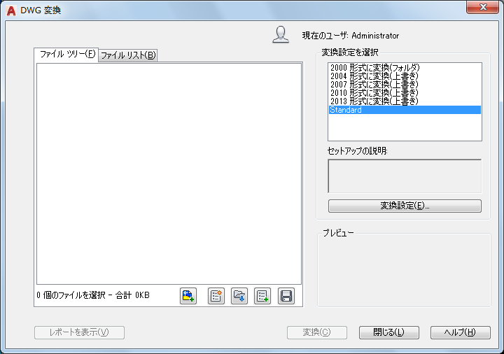 標準のファイル選択ダイアログ ボックスが表示されて、図面ファイルを選択して変換リストに追加できます。このボタンは[ファイル ツリー]タブと[ファイル リスト]タブの両方で使用可能です。