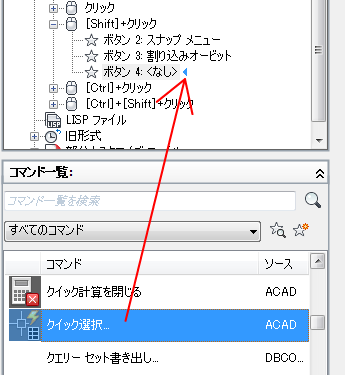 マウス ボタンに追加するコマンドを、[コマンド一覧]ペインから[