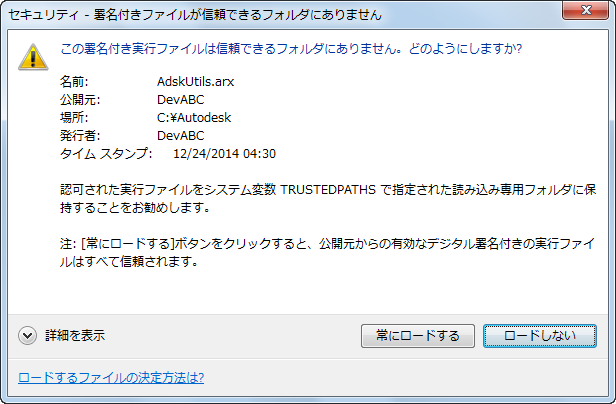 解決策 : ファイルをロードし、予定通りに使用します。必要に応じて、この発行元を信頼して、この発行元の署名があるファイルのすべてにメッセージ ボックスが表示されないようにします。