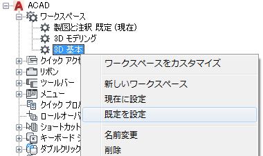 CUIx ファイル内のワークスペースを既定としてマークすることができます。ワークスペースを既定として設定すると、CUIx ファイルが最初にプログラムにロードされたとき、または CUIx ファイルが CUILOAD[CUI ロード]コマンドを使用してロードされた後、このワークスペースが呼び出されると決定されます。