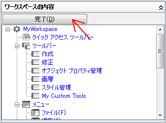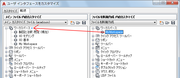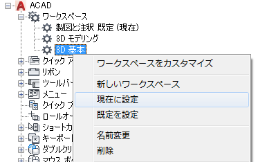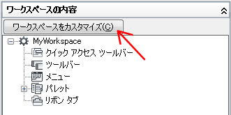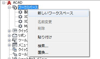 ワークスペースを現在に設定したり、ワークスペースを作成または修正したり、部分 CUIx ファイルからメイン CUIX ファイルにワークスペースを読み込むことができます。
