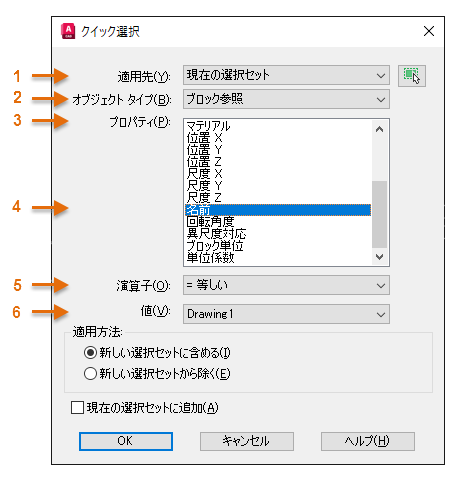 - [クイック選択]ダイアログ ボックスで、[ブロック参照]を選択し、リストから[A410]を選択します(下図の 1 ~ 6 を参照)
