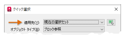 現在、画層 001 abc 上のすべてのブロックが選択されています。[適用方法]フィールドが、下図に示すように、自動的に[現在の選択セット]に切り替わっている点に注目してください。