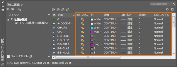 画層の優先プロパティが現在のレイアウト ビューポートに適用されます。現在の画層にするためにレイアウト ビューポートをダブルクリックすると、[画層プロパティ管理]に余分な列が表示されます。