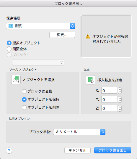 現在の図面で選択されたオブジェクト(1 つまたは複数)を、ファイルとして保存した後で現在の図面のブロックに変換します。