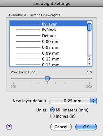 Sets the current lineweight, sets the lineweight units, controls the display and display scale of lineweights, and sets the DEFAULT lineweight value for layers.